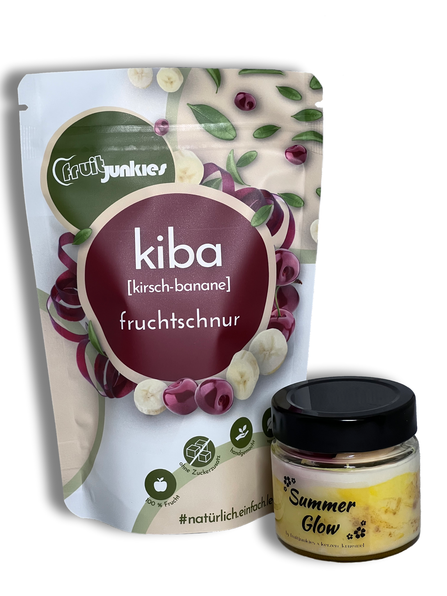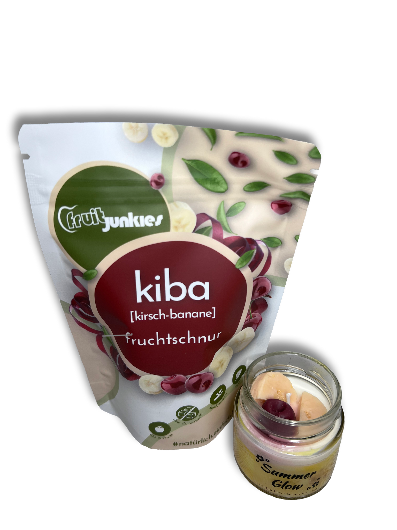 Wenn’s draußen grau und kalt wird, hol dir mit unserer KiBa-Kerze das Sommerfeeling zurück. Der Duft von Kirsche erinnert an warme Tage und Sonnenschein. Dazu gibt’s unsere fruchtigen Kirsche- und Bananen-Schnüre – so snackst du dir den Sommer einfach zurück ins Wohnzimmer.